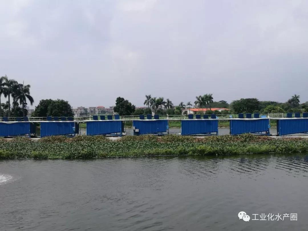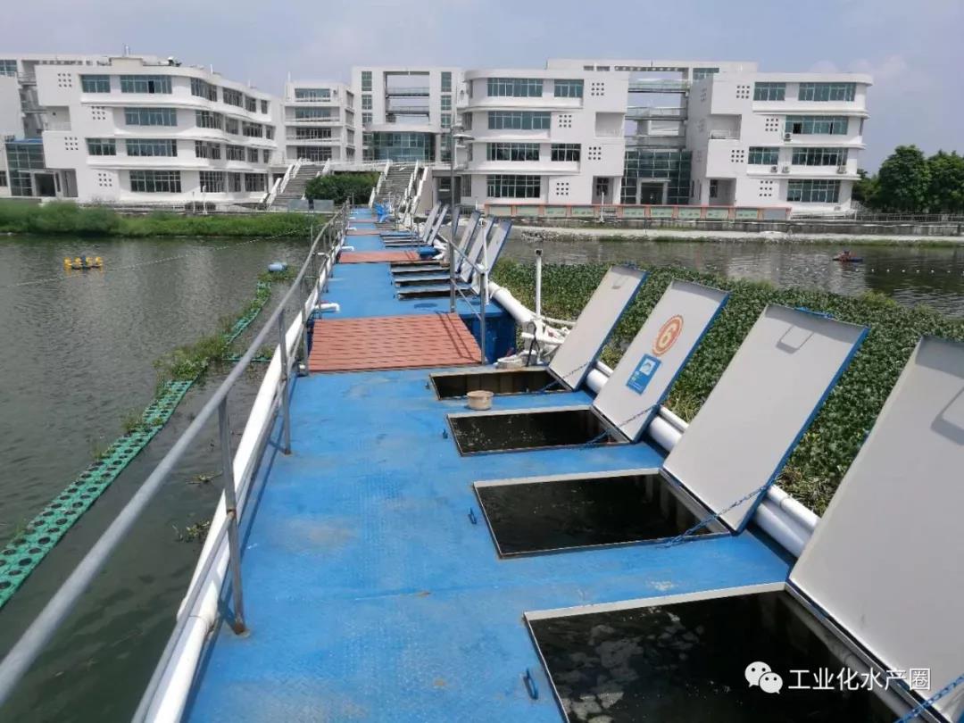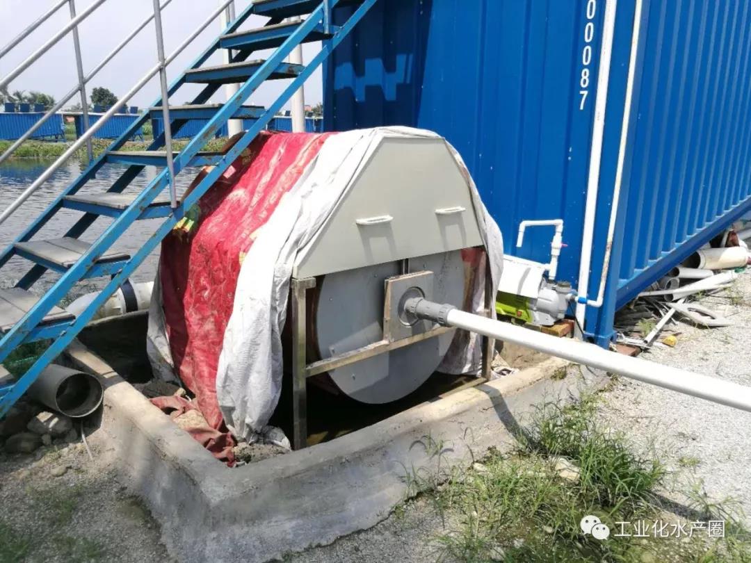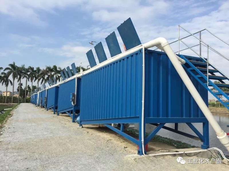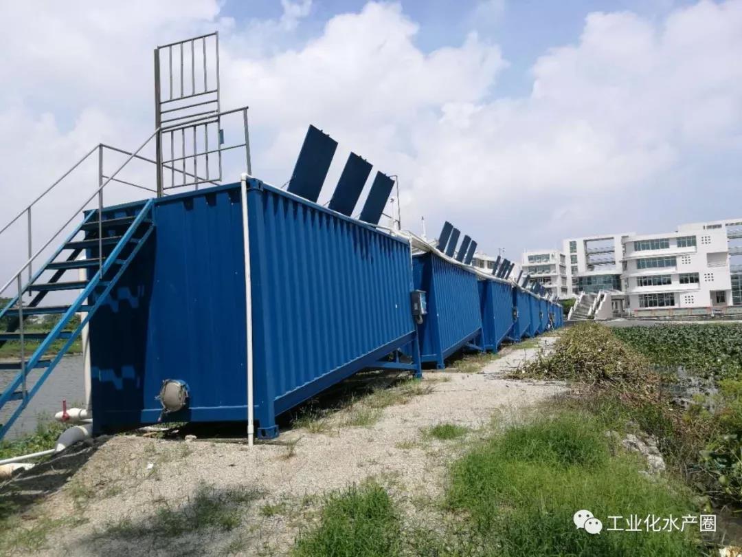 陆基推水集装箱养殖模式一般为2-7个集装箱配备1亩净化池塘(水深1.5米),箱体与池塘形成一体化的循环系统。
